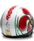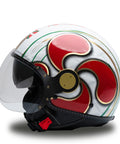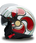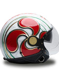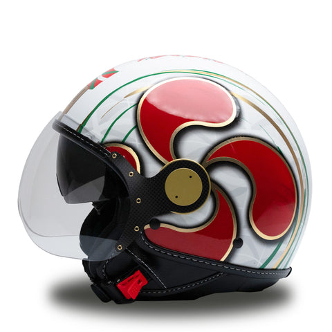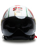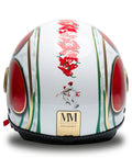 O capacete independente do Jet MM é renovado em uma esplêndida versão branca com detalhes vermelhos, verdes e dourados, embelezados com acabamentos exclusivos do Chrometech Gold e enriquecidos pelos detalhes característicos que distinguem os capacetes da linha MM. Esta versão é única e não possui variantes de cores.