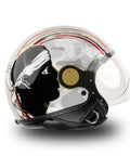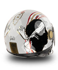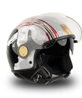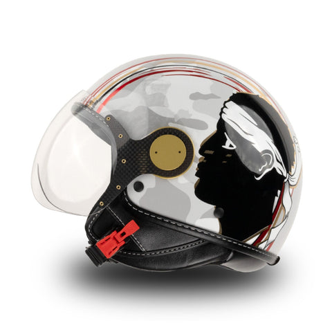 O capacete independente do Jet MM é renovado em uma esplêndida versão de gelo cinza com detalhes vermelhos, pretos e dourados, embelezados com acabamentos exclusivos de ouro Chrometech e enriquecidos pelos detalhes característicos que distinguem os capacetes da linha MM.