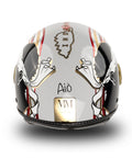 Esta edição especial é aprimorada ainda mais por representações fascinantes da Córsega, com seu icônico perfil de cabeça Moro, ouro e detalhes vermelhos e a palavra "aiò" nas costas. As linhas elegantes e dinâmicas que cercam o capacete lembram as cores da bandeira de corrida. Este modelo representa a ponta de lança da série "Liberdade na liderança", combinando a excelência artesanal e um sentimento de pertencimento.