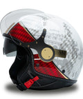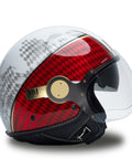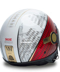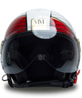 O capacete independente do Jet MM é renovado em uma esplêndida versão branca com detalhes vermelhos, dourados e pretos, embelezados com acabamentos exclusivos do Chrometech Gold e enriquecidos pelos detalhes característicos que distinguem os capacetes da linha MM.