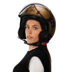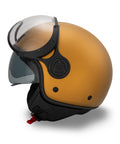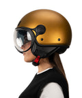 Con doppia visiera e standard ECE 22.06, è pensato per l'uso reale, tra città e weekend: uno stile da casco jet minimal che non dipende dalle mode. Il colore non è un oro cromato luccicante: è un ocra intenso effetto oro, terroso e vintage, che richiama i colori delle moto classiche anni '70 e i tramonti californiani. Realizzato completamente in Italia con calotta di ultima generazione, è la scelta per chi cerca una tonalità calda e distintiva con anima retrò.